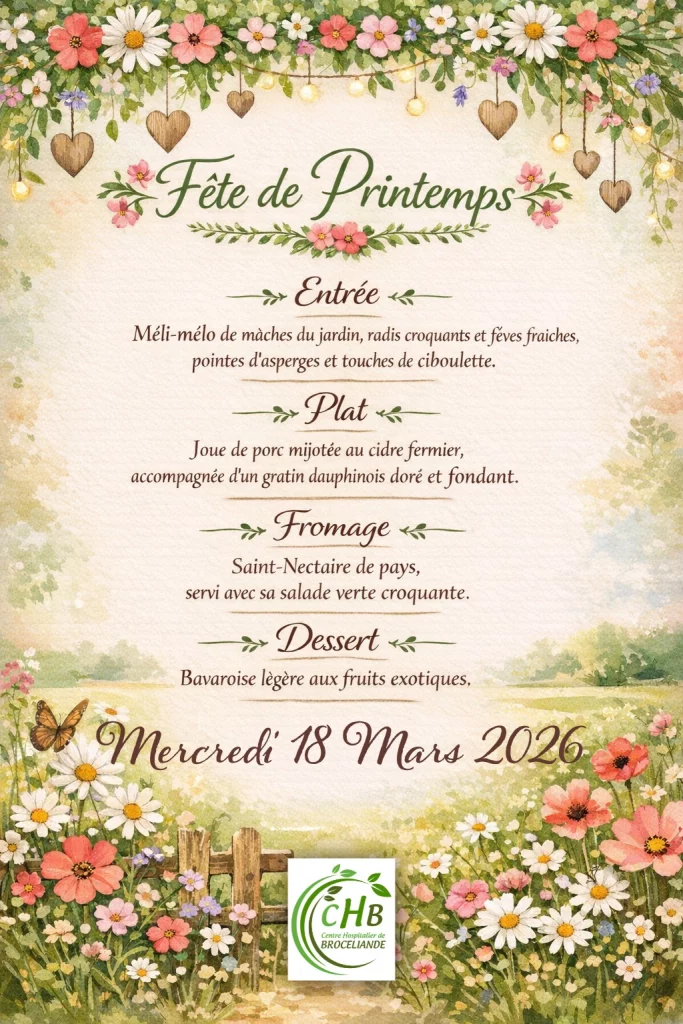 Le mercredi 18 mars 2026, un menu spécial “Fête de Printemps” sera proposé, mettant à l’honneur des produits frais et des saveurs de saison.