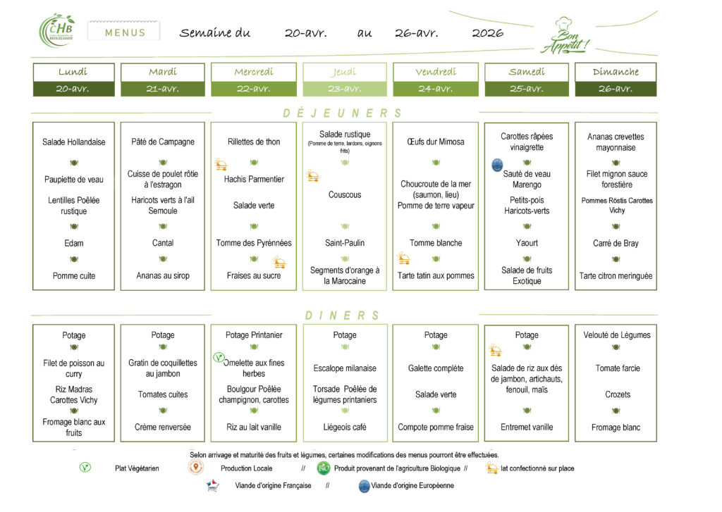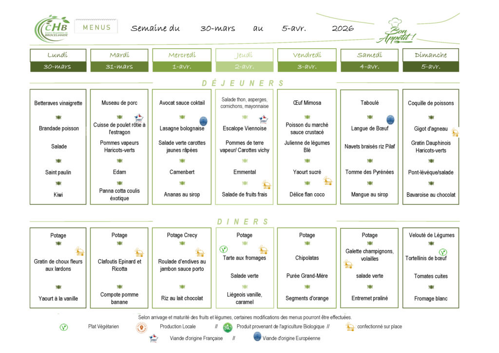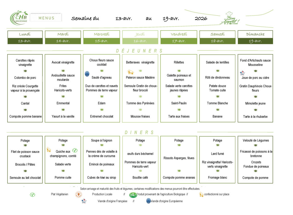 Au Centre Hospitalier de Brocéliande, une attention particulière est portée à la qualité et à la diversité des repas proposés aux résidents. Chaque semaine, les équipes de restauration élaborent des menus équilibrés en privilégiant des produits locaux et de saison, garants de fraîcheur, de goût et de qualité nutritionnelle.